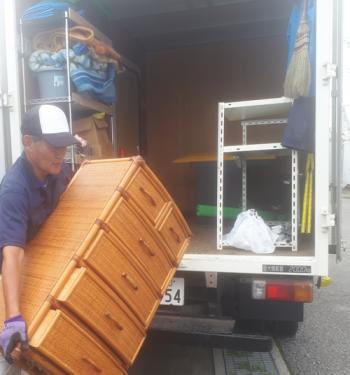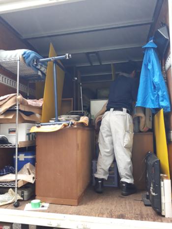持っていく予定のタンスや棚・鏡台・衣類など準備ができている物を、2tアルミバンに入れて出発(写真は1往復目)。