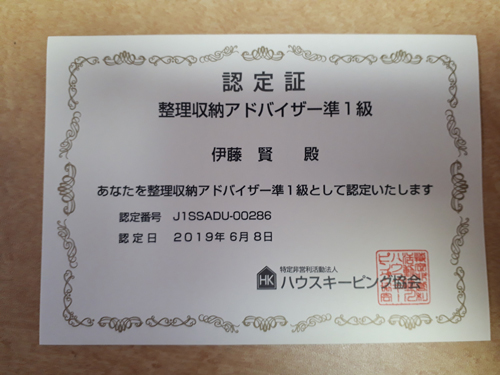 整理収納アドバイザー準1級認定書いただきました。