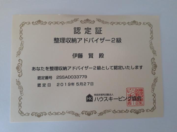 整理収納アドバイザー2級(ハウスキーピング協会)認定書をいただきました。