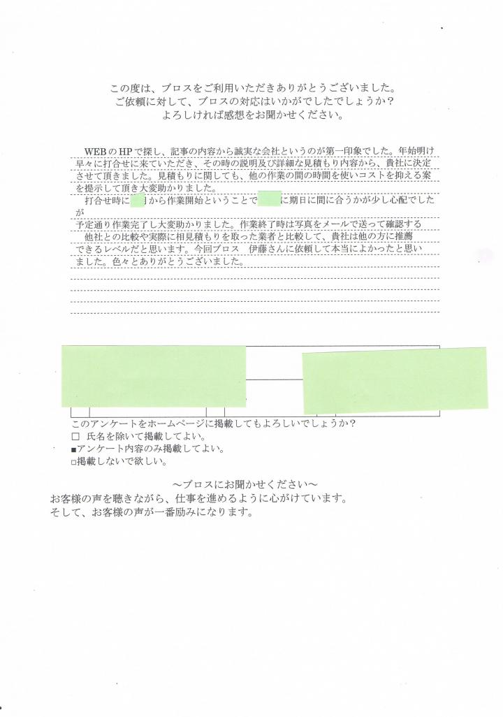 アンケートありがとうございます。 嬉しいお言葉ありがとうございます。 大きな会社ではありませんので、「誠実」「丁寧」「状況判断」「臨機応変」「コミニケション」を大事にしています。 カギをお預かりして作業をさせていただきありがとうございました。 価格にも反映させていただきました。 貴重品類 など、ご依頼者が出来る箇所はご依頼者が遺品整理 を行い、やりにくい箇所の作業をさせて頂きました。 他の仕事との兼ね合いの為、午前中ですとか午後だとか、お近くですので空いた時間を利用して作業を行いました。 作業期間中は、進捗などを写真を添えてメールにて報告させていただきました。 依頼者様のご協力もあり無事終了することが出来ました。 処分品が少なくなるように、丁寧に仕分けをしリサイクル ・リユース を多数行うことが出来ました。 きれいなタオルやオムツ・パット類は介護施設 に寄付させて頂きました。 作業終了時には、温かいお言葉もいただきありがとうございました。