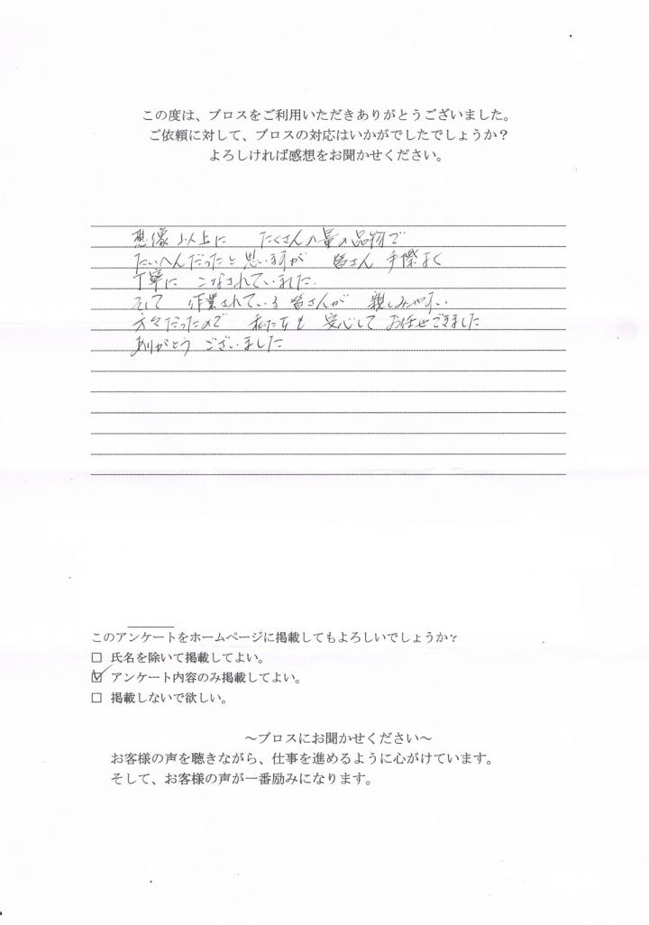スタッフを親しみやすいとのことありがとうございます。 スタッフは人柄を大事にしています。 今後も作業を丁寧に行うことはもちろんのこと、ご依頼者とのコミニケションを大事にしていきたいと思います。 残暑の中、5日間ご依頼者(長女、次女、長男)の皆様に協力いただ遺品整理 ・生前整理 を無事終わらすことが出来ました。 特にご依頼者夫婦・次女様には作業日は予定を組んで頂き毎回来ていただきありがとうございました。 ご依頼者の方々も親しみやすく、上手にコミュニケーションがとれスムーズに作業出来ました。 処分品が少なくなるように、丁寧に仕分けをしリサイクル ・リユース を多数行うことが出来ました。 作業終了時には、温かいお言葉もいただきありがとうございました。 |