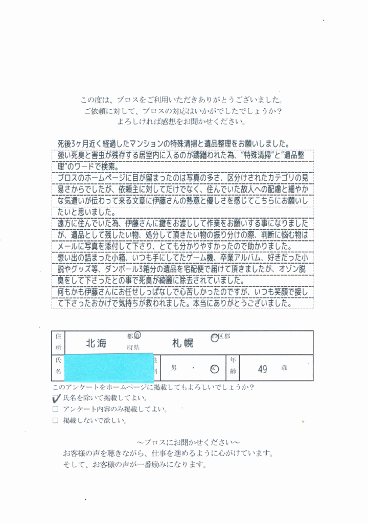 依頼者様(お母様)が冷静に状況説明をして頂き作業をし易い環境を作っていただきありがとうございました。