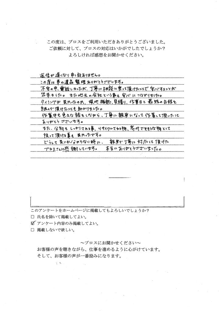 地元で近いとのこともありましたが、依頼者様の配慮によりスムーズに遺品整理 を終了することが出来ました。